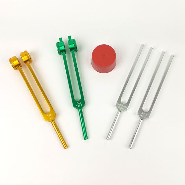 Pack de 4 diapasones Otto 128hz, OM 136.10, Fundamental, Theta, activador y baqueta de goma (incluye fundas de terciopelo).